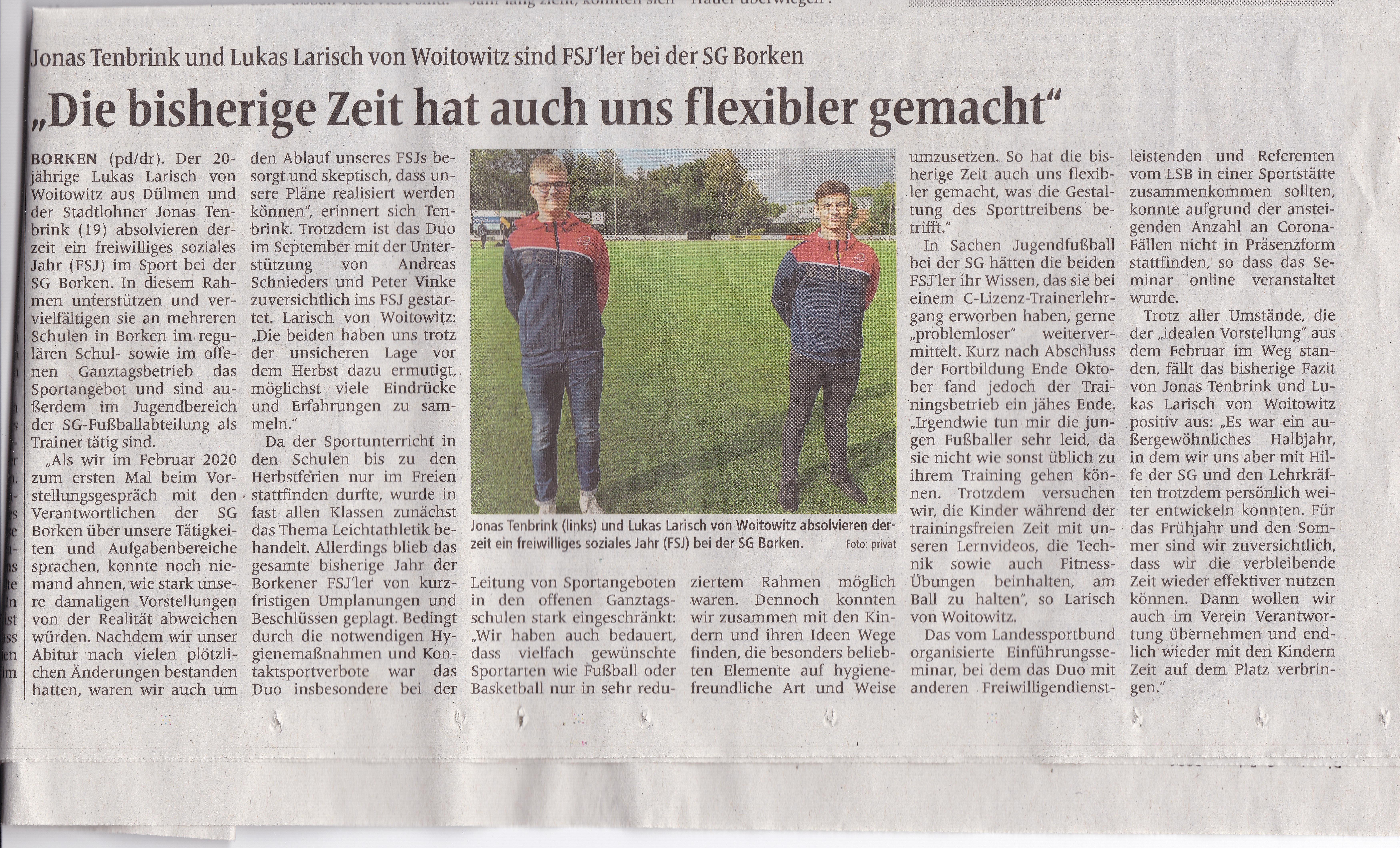 Wir, das sind Lukas Larisch v. W., 20 Jahre alt, aus Dülmen, und Jonas Tenbrink, 19 Jahre alt, aus Stadtlohn, absolvieren in diesem Jahr ein freiwilliges soziales Jahr im Sport bei der SG Borken, in dessen Rahmen wir an mehreren Schulen in Borken im regulären Schul- sowie im offenen Ganztagsbetrieb das Sportangebot unterstützen und vervielfältigen und außerdem im Jugendbereich der Fußballabteilung bei der SG Borken als Trainer tätig sind.