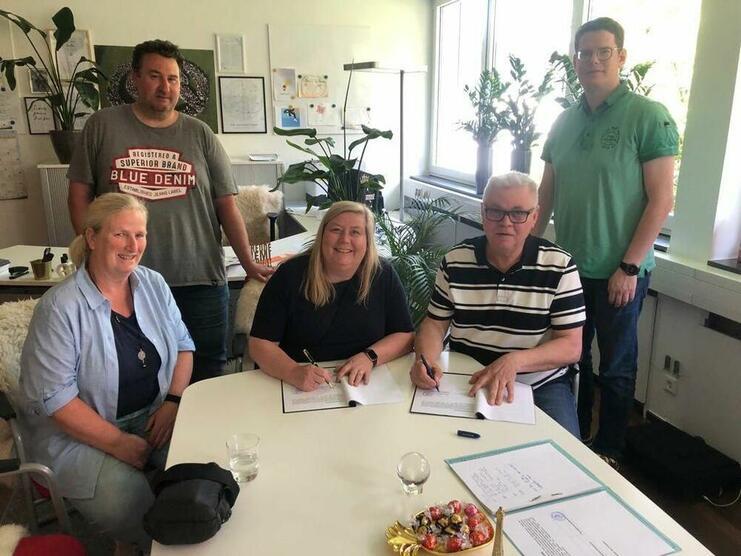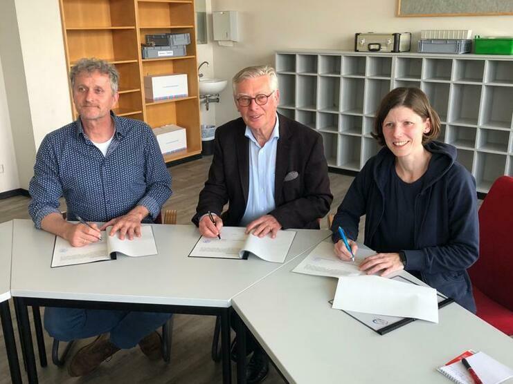 Von links: Axel Heinz (Schulleiter der JKG), Wilhelm Terfort (Ehrenvorsitzender der SG Borken) und Mona Kugler-Höing (stellv. Schulleiterin RGS) unterzeichnen die Kooperationsverträge.