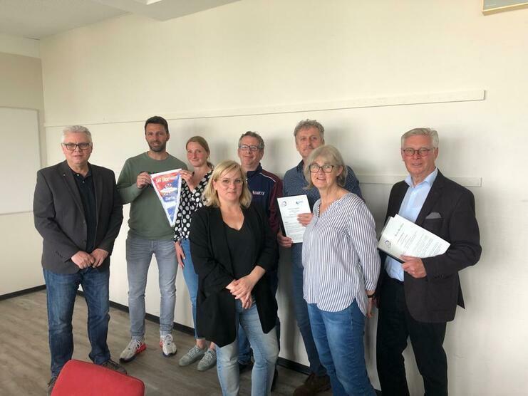von links: Andrea Landsknecht (Sportkoordinatorin des Remi), Oliver Voss (stellv. Schulleiter), Birgit Prangenberg (Schulleiterin des Remi), Andreas Schnieders (Beauftragter Schule/Verein SG Borken), Markus Hilvert (Geschäftsführer SG Borken)