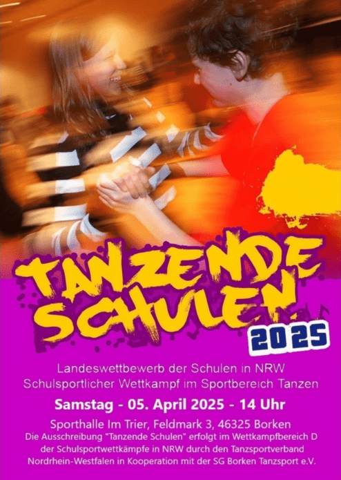 Am vergangenen Samstag verwandelte sich die Sporthalle im Trier in Borken in eine pulsierende Tanzarena, als die SG Borken Tanzsport e.V. den Landeswettbewerb „Tanzende Schulen NRW“ ausrichtete. Mehr als 350 Schülerinnen und Schüler aus 21 Schulen in Nordrhein-Westfalen reisten zu diesem spannenden Event an und sorgten für einen neuen Teilnehmerrekord. Die Veranstaltung findet einmal im Jahr statt und die Kreisstadt Borken hatte die Ehre Veranstaltungsort in 2025 zu sein. Der Tanzsportverband Nordrhein-Westfalen (TNW) organisierte den Turnierablauf.