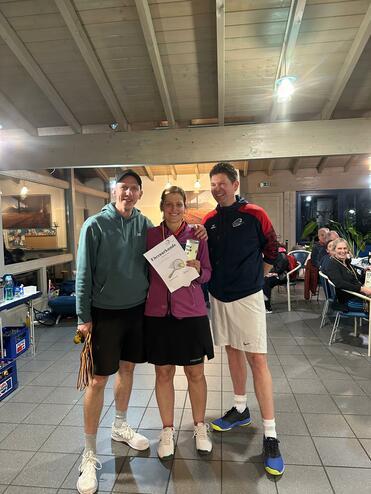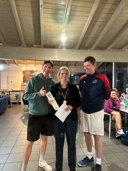 ein super Abschlussevent geboten hat. Im Aushang konnten wir uns auf dem Spielplan über die zeitliche Planung des Turniers, fünf Runden Doppel mit wechselnden Partnern und dem anschließenden Quiz, informieren und im Tennisheim die wertvollen Preise (für jeden Teilnehmer gab es einen Preis) in Augenschein nehmen. Die Spielpartner und die Spielpaarungen für die fünf Runden hatte Uwe aufwändig entsprechend dem erzielten Punkteschnitt der Spieler in der Winterrunde zusammengestellt. Dadurch ergaben sich interessante Matches mit spannenden Ballwechseln und überraschende Spielausgänge. Als Schiedsrichter fungierten Wilhelm Terfort und Walter Beckmann, die aufgrund von Verletzungen nicht teilnehmen konnten.