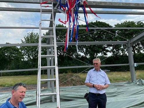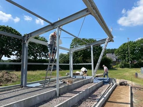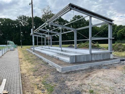 Gut 5 Monate hat die Errichtung und Ausstattung gedauert. Angefangen hat die Fa. Kanalservice Cornel Wansing im April mit den Erdarbeiten. Danach folgte die Fa. Brüninghoff aus Heiden, sie goss die Fundamente und errichtete die Stahlkonstruktion. Die Stützen und Träger stammen von der alten Tribüne am Hauptplatz und sehen nach Fertigstellung und abschließender Lackierung aus wie neu.