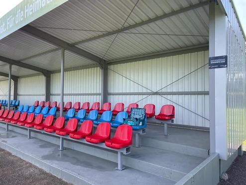 Die Tribüne bietet 80 Sitzplätze an und hat zusätzlichen Platz für ca. 100 stehende Zuschauer. So sind wir u.a. auch gut gerüstet für ein Spitzenspiel oder Derby auf dem Kunstrasenplatz. Das ist klasse – wir freuen uns riesig !