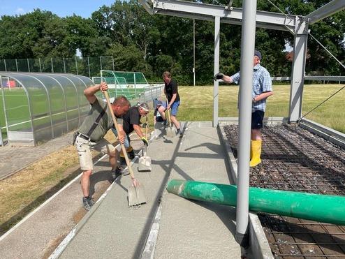 Die Malerarbeiten wurden von Rudi Suchy übernommen, unterstützt vom Malerbetrieb Strauch GmbH und von der schnellen Eingreiftruppe mit Appi Bußkönning, Manfred Körntgen, Heiner Triphaus und Alfons Gedding. Diese Truppe leistete an der Tribüne insgesamt ca. 600 Stunden Eigenleistung. Unterstützung kam aber auch aus dem Vorstand und von den Mannschaften von der Jugend bis zu den Alten Herren. Das war wirklich herausragendes Teamwork. Und so konnten die Arbeiten wie das Setzen der Kantsteine, das Gießen der Betonstufen der Aufbau der Unterkonstruktion für die Sitzschalen und das Montieren der Sitzschalen komplett in Eigenleistung erbracht werden.